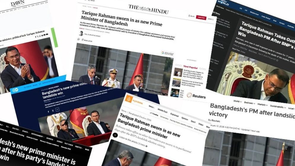 বার্তা সংস্থা রয়টার্স তাদের সংবাদের শিরোনাম দিয়েছে, ‘নির্বাচনে নিরঙ্কুশ জয়ের পর বাংলাদেশের প্রধানমন্ত্রী হিসেবে শপথ নিলেন তারেক রহমান’।