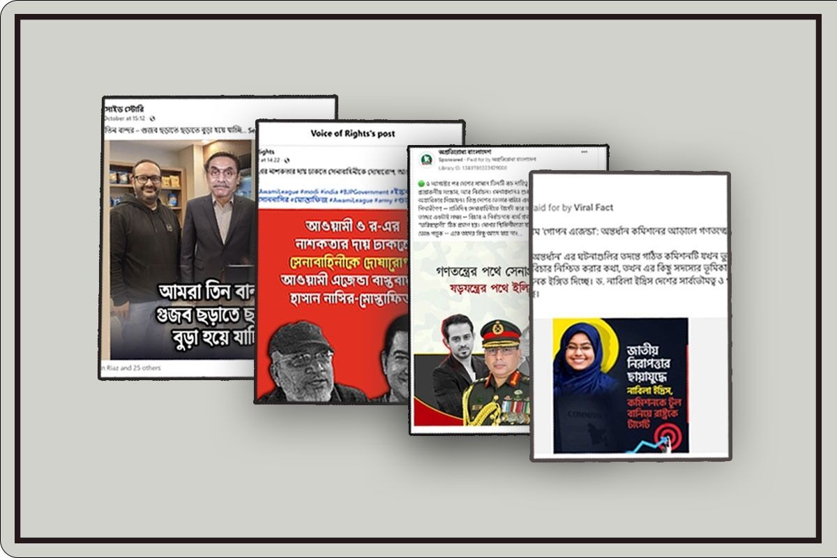 যেমন, একই ক্যাপশন/ফটোকার্ড অল্প সময়ের ব্যবধানে অনেকগুলো পেইজে পোস্ট করা হয়। এবং এসব পোস্ট ও ফটোকার্ড নতুন ও পুরোনো মিলিয়ে বহু পেইজে কাছাকাছি সময়ে বিজ্ঞাপন হিসেবে প্রমোট করে রিচ বাড়ানো হয়। সেই সঙ্গে পেইজগুলোতে নির্দিষ্ট কিছু হ্যাশট্যাগের ঘনঘন ব্যবহার লক্ষ্য করা যায় (#ICT, #army, #গুম, #DGFI, #mediatrail, #fakenews ইত্যাদি)।
