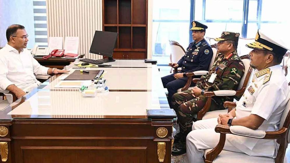 গণপ্রজাতন্ত্রী বাংলাদেশ সরকারের প্রধানমন্ত্রী তারেক রহমানের সঙ্গে সাক্ষাৎ করেছেন সেনা, নৌ ও বিমানবাহিনীর প্রধানরা।