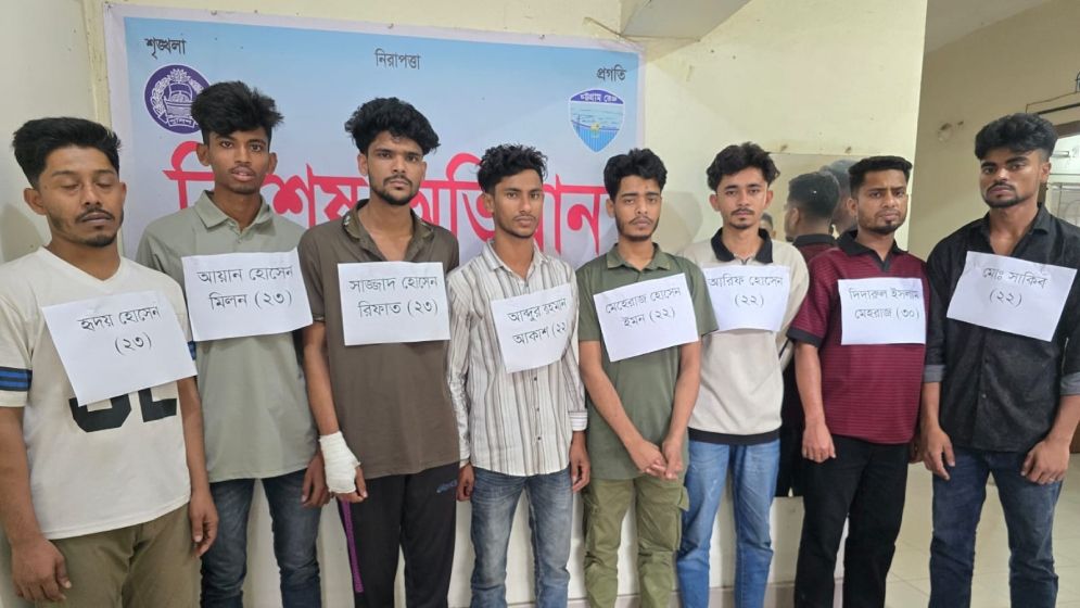 গ্রেপ্তাররা হলেন— দিদারুল ইসলাম মেহেরাজ, আব্দুর রহমান আকাশ, সাজ্জাদ হোসেন রিফাত, আয়ান হোসেন মিলন, আরিফ হোসেন, হৃদয় হোসেন, মো. সাকিব ও মেহেরাজ হোসেন ইমন। তারা দেওপাড়া, লতিফপুর, পশ্চিম লতিফপুর ও পাঁচপাড়া এলাকার বাসিন্দা। বুধবার সারাদিন অভিযান চালিয়ে পুলিশ তাদের গ্রেপ্তার করে।