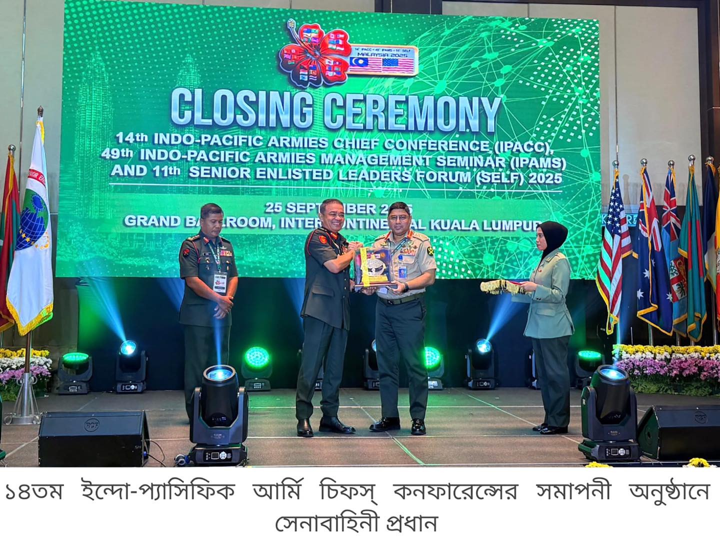 ঢাকা, ২৭ সেপ্টেম্বর ২০২৫: মালয়েশিয়ায় অনুষ্ঠিত ১৪তম ইন্দো-প্যাসিফিক আর্মি চিফস্ কনফারেন্সে (IPACC) অংশগ্রহণ শেষে দেশে ফিরেছেন সেনাবাহিনী প্রধান জেনারেল ওয়াকার-উজ-জামান, এসবিপি, ওএসপি, এসজিপি, পিএসসি। তিনি গত ২৬ সেপ্টেম্বর রাতে ঢাকায় পৌঁছান।